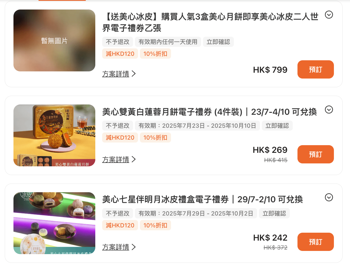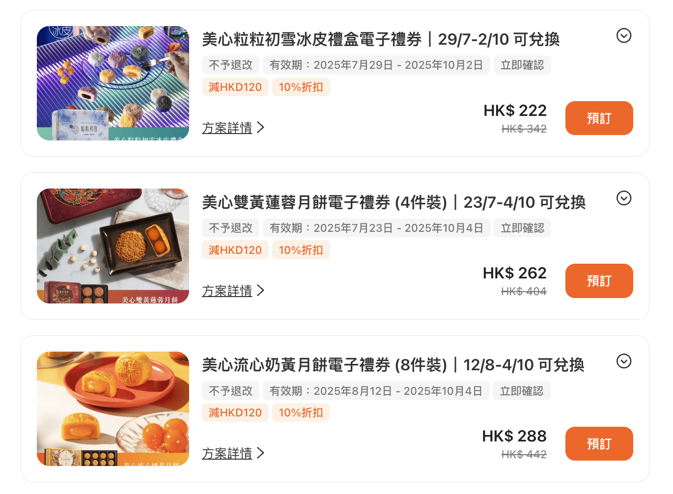 | 美心低糖蛋黃蓮蓉月餅電子禮券(6件裝) >>立即預訂<< | $267 | $412 | 以糖醇代替砂糖打造低糖蓮蓉,健康且無負擔。 |