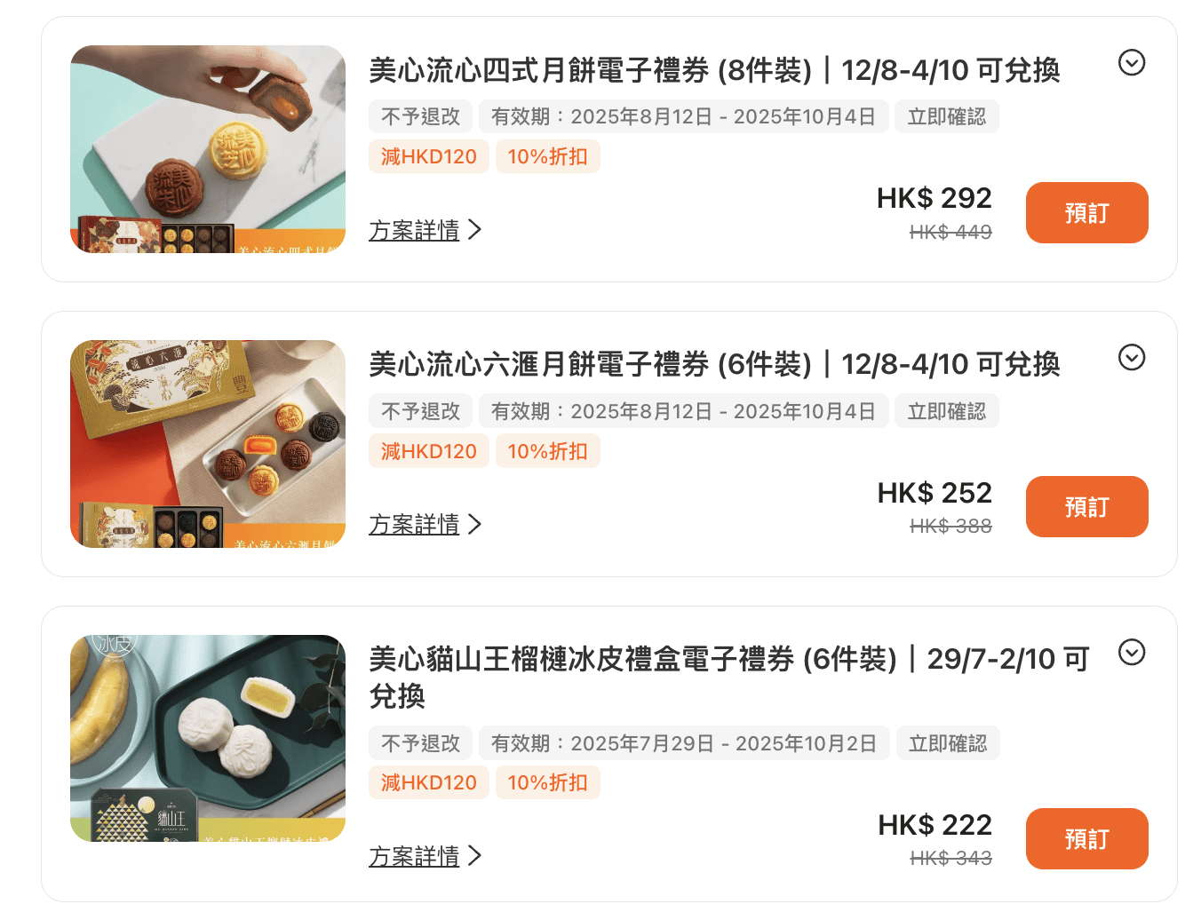 | 美心流心六滙月餅電子禮券(6件裝) >>立即預訂<< | $252 | $388 | 六款多樣流心口味齊聚,包括黑松露奶黃與椰子月餅,口感獨特。 |