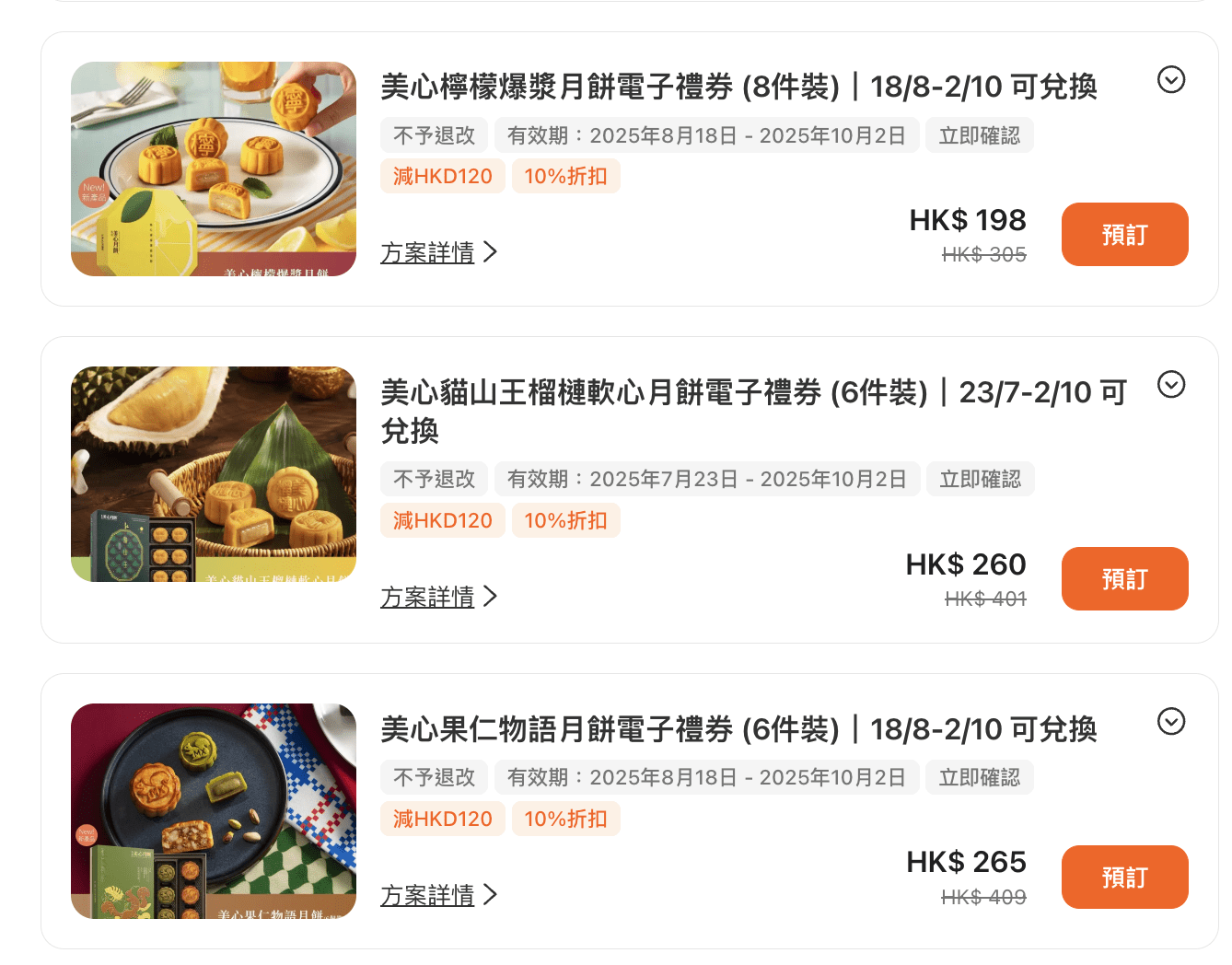 | 美心檸檬爆漿月餅電子禮券(8件裝) >>立即預訂<< | $198 | $305 | 採用酸甜清爽的檸檬醬心爆漿設計,入口即感驚喜。 |